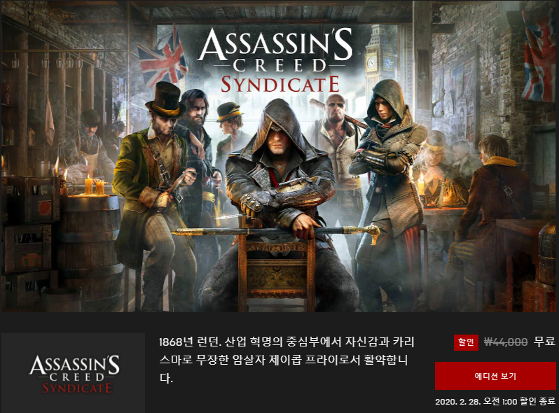 현재 2월 28일까지 어쌔신크리드 신디케이트(Assassin's Creed Syndicate) 무료로 배포 중입니다.
