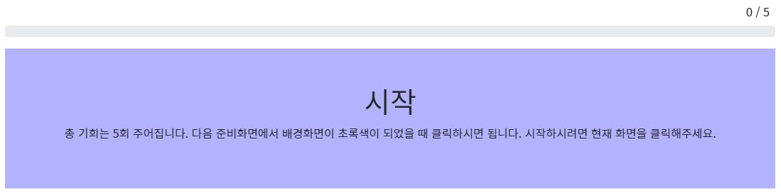 총 5회 테스트를 하며 "테스트 시작" 을 누르고 보라색 화면을 클릭
