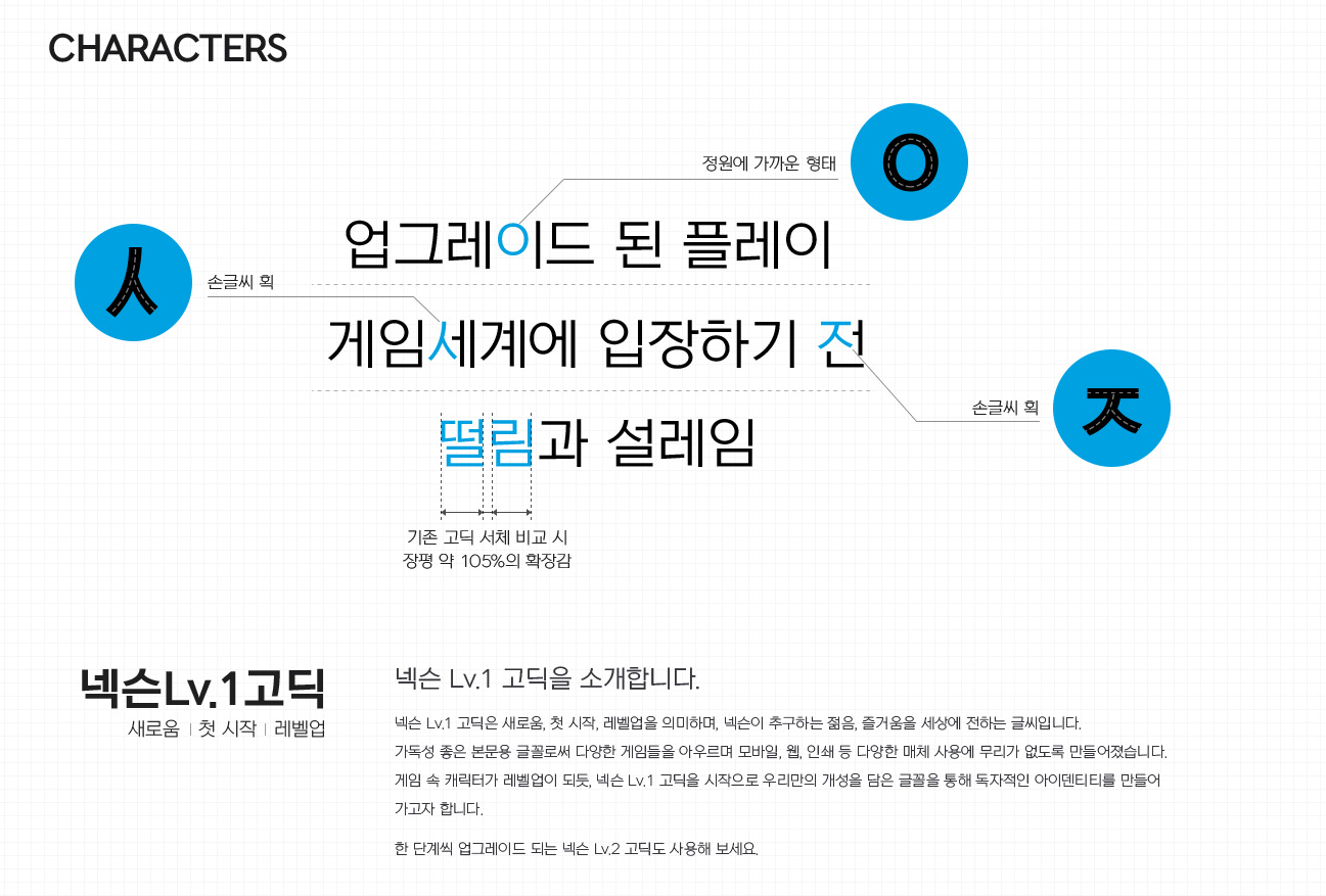 LEVEL UP의 첫 단계로 게임에서 경험했던 느낌을 서체에 담아 표현했습니다. 서체의 기능적인 부분 외에도 즐거운 경험들을 전달하고자 하는 또 다른 도전의 시작입니다.