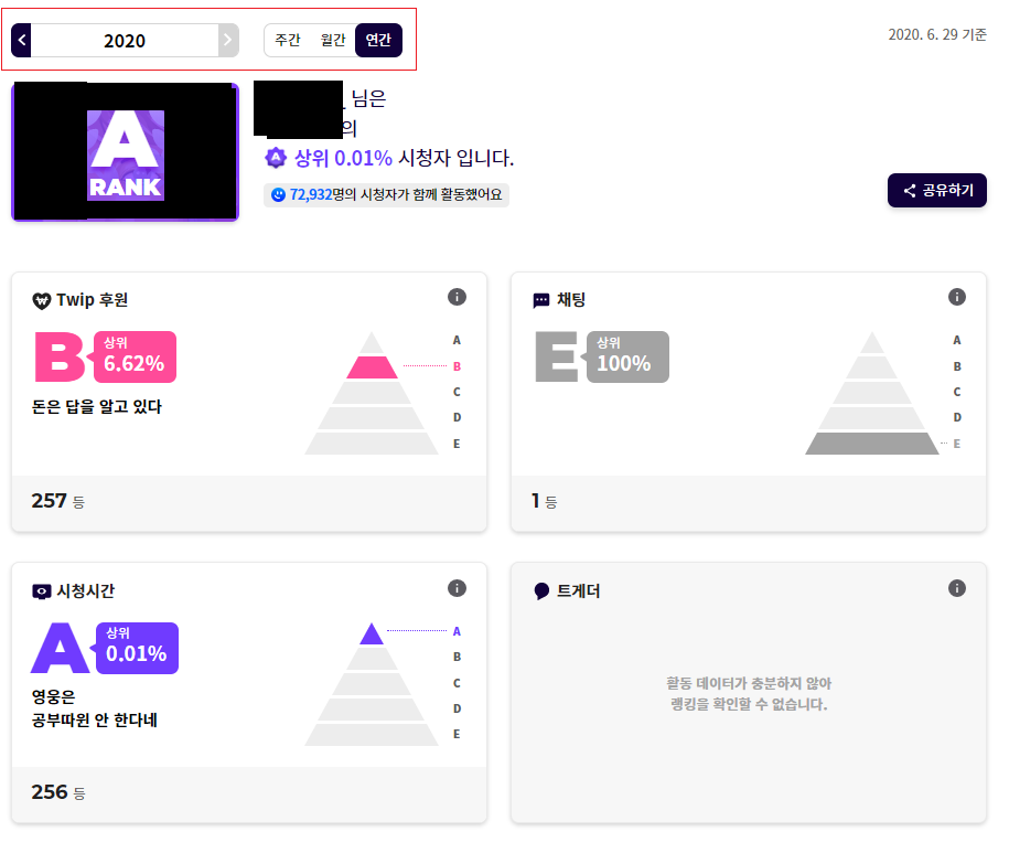 그러면 후원 순위와 채팅 순위, 시청시간 순위, 트게더 순위가 나오게됩니다.